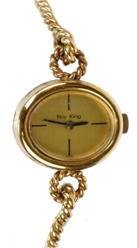Lot 1846 of 2482: ROY KING; a lady's vintage 9ct yellow gold wristwatch with oval dial and rope twist bracelet, with original guarantee dated 1978, total approx 17.7g.