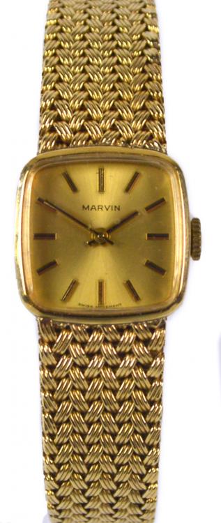 Lot 1847 of 2482: MARVIN; a 9ct yellow gold lady's wristwatch, the square dial set with baton numerals, on integral 9ct yellow gold textured bracelet, diameter of dial 2cm.