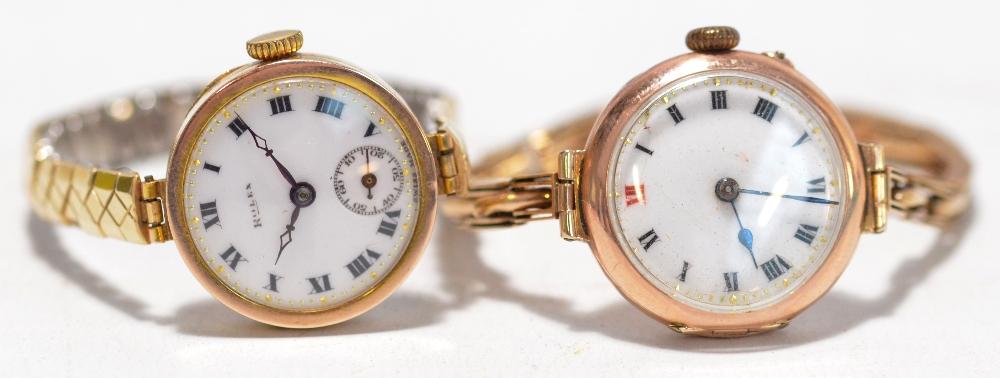 Lot 1848 of 2482: ROLEX; a 9ct yellow gold mid-20th century lady's wristwatch, the circular white enamel dial set with Roman numerals and a subsidiary seconds dial and inscribed 'Rolex Swiss made', the movement with fifteen jewels, diameter 2.5cm on a gold plated expanding bracelet and a 9ct rose gold lady's wristwatch, the white dial set with Roman numerals with red XII, diameter 2.5cm on a 9ct gold expanding bracelet (2).