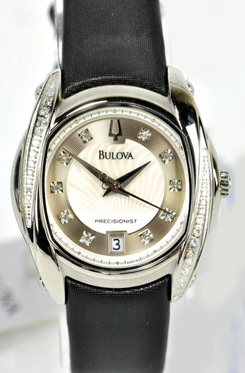 Lot 1850A of 2482: BULOVA; a boxed Precisionist automatic ladies' wristwatch, the circular dial set with small diamonds for numerals with logo at 12 o'clock and date aperture at 6 o'clock, diameter 2.3cm, the bezel set with two rows of small diamonds, on a leather strap, with certification and receipt.