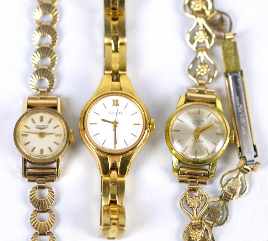 Lot 1851 of 2482: LONGINES; a lady's 9ct yellow gold wristwatch, the circular dial set with gold baton markers, and two further lady's wristwatches (3).