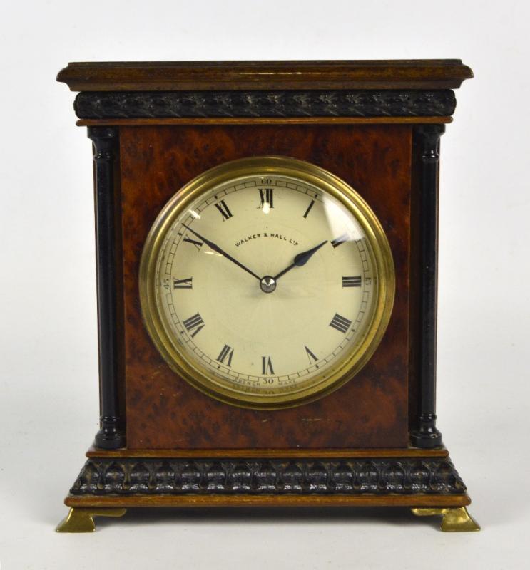 Lot 1873 of 2482: An early 20th century amboyna mantel clock of small dimensions with relief pediment and plinth and corner columns to brass feet, the circular textured dial bearing Roman numerals and inscribed with the retailer's name 'Walker & Hall Ltd', the French movement numbered 38650, width 16.5cm.