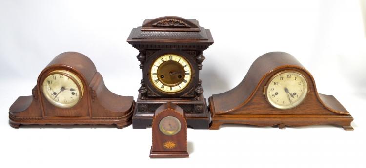 Lot 1874 of 2482: Two early 20th century oak cased mantel clocks, the silver dials set with Arabic numerals, the wider 49cm, also a contemporary German 14 day striking clock, the enamelled chapter ring set with Roman numerals and with paper labels to interior for Wurttemberg manufacture and numbered 1078, height 37cm, and a mahogany cased mantel clock of small proportions (4).