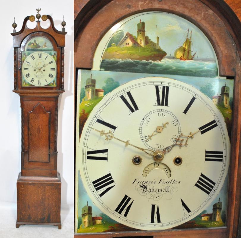Lot 1880 of 2482: An early 19th century mahogany and oak longcase clock, the arch painted dial inscribed 'Francis Foulkes, Bakewell', with eight day movement, arch door, moulded corner pilasters and plinth base to bracket feet, height approx 219cm.
