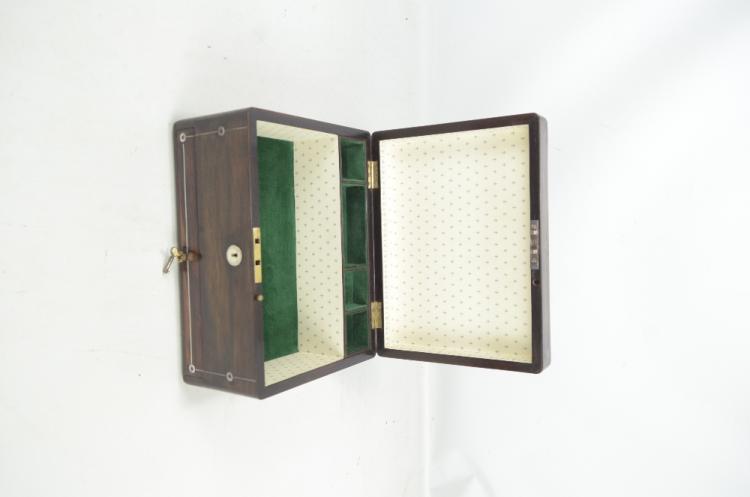 Lot 8 of 2137: A rosewood and mother of pearl inlaid vanity box with restored green baize lined interior and lower drawer, approx 30 x 22cm.