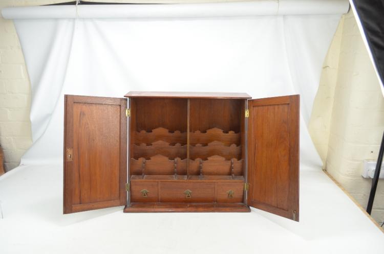 Lot 17 of 2137: An oak table top stationery cabinet, the two drawers with carved leaf and berry detail enclosing fitted interior of letter racks, pen rests and three drawers, 48 x 53.5cm.