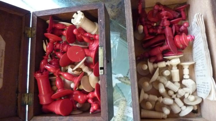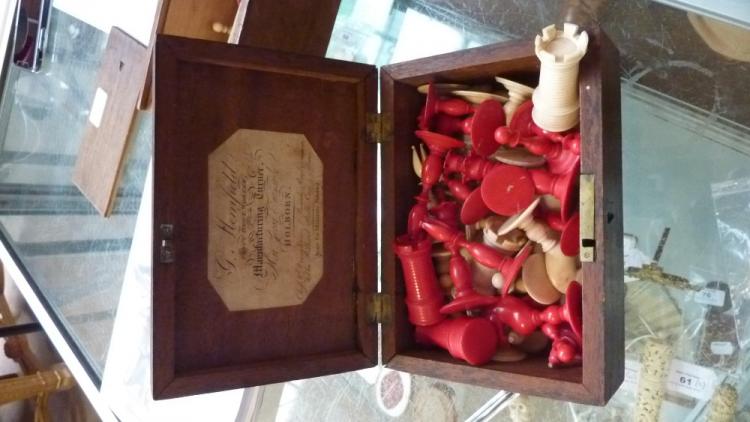 Lot 55 of 2137: G MERRIFIELD OF HOLBORN; a late 19th century ivory and stained ivory part complete chess set, one pawn a replacement bone piece and several pieces damaged, in original mahogany box with manufacturer's paper label to interior, height of king 7.5cm, and a smaller bone and stained bone part complete set, also with damaged pieces.