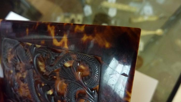 Lot 58 of 2137: A pair of late 19th century ivory mounts, one with pierced foliate decoration, presumably from an aide-memoire, also two tortoiseshell examples carved with dragons (3).