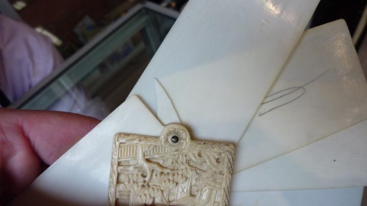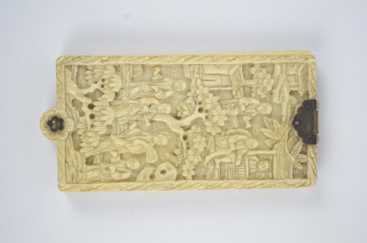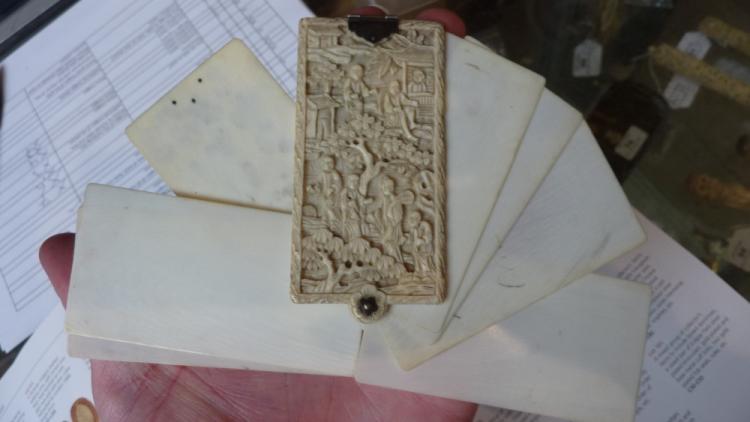 Lot 70 of 2137: A circa 1900 Chinese ivory aide-memoire, the front and back carved with Chinese scholars in garden setting, with six pages, length 9cm (af).