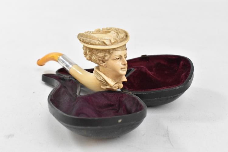 Lot 80 of 2137: A late 19th/early 20th century clay pipe modelled as a lady wearing hat with sterling silver collar and amber mouthpiece.