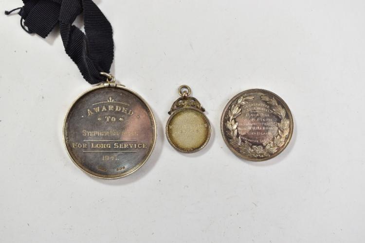 Lot 93 of 2137: A hallmarked silver medal for the Institute of Clayworkers with inscription to reverse 'Awarded to Stephen Granger for Long Service 1941', diameter 5.6cm, a smaller silver medal inscribed 'Co-Operative Wholesale Society Ltd Flour Mill Silvertown Bread Competition 1932 won by Mr H. Marriott Portsea Island', and a small Nottm Institute Association fob medal inscribed to reverse 'Whist Pairs 1937-8' (3).