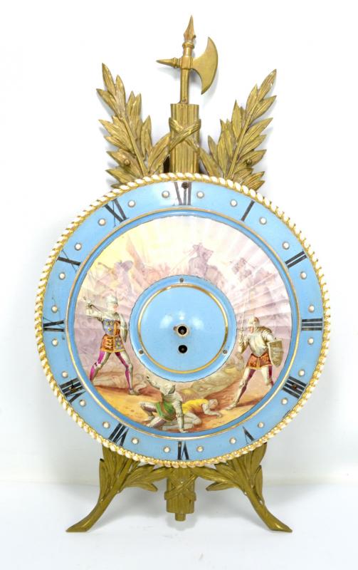 Lot 894 of 2137: A 19th century Continental ceramic wall clock, the circular face hand painted with battle scene inside Roman numerals and gilt metal surround, unmarked, height 63cm, diameter 36cm.