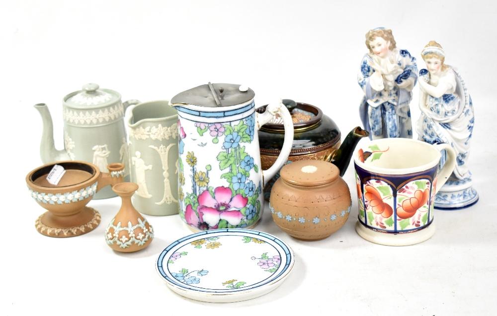 Lot 898 of 2137: A mixed group of ceramics including Royal Doulton Slaters patent teapot, Losol ware jug on stand, Gaudy Welsh mug, pair of figures etc.