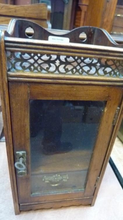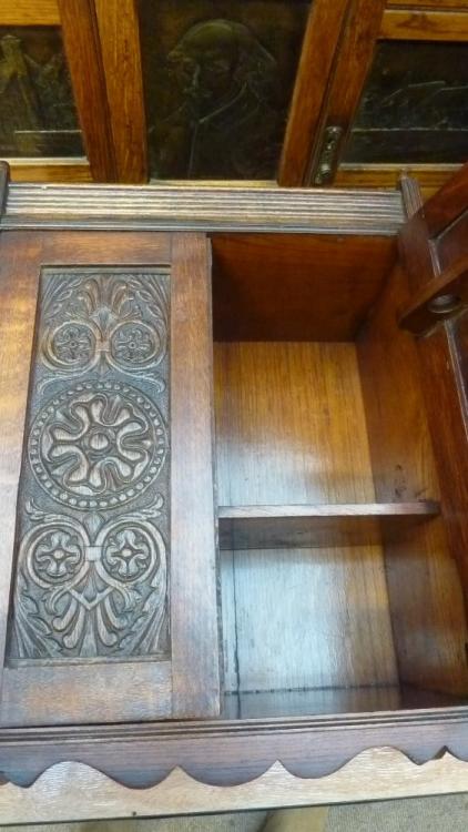 Lot 40 of 2418: Three early 20th century smokers' cabinets including oak example with two carved and panelled doors enclosing two interior drawers, height 46cm, further oak example with two glazed doors etc.