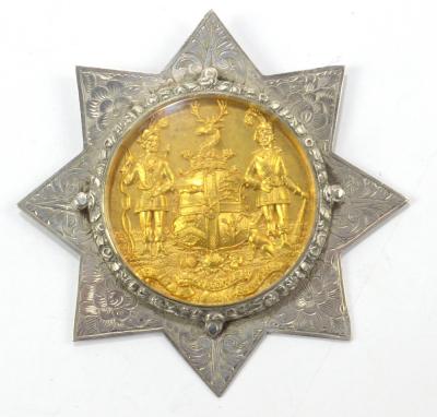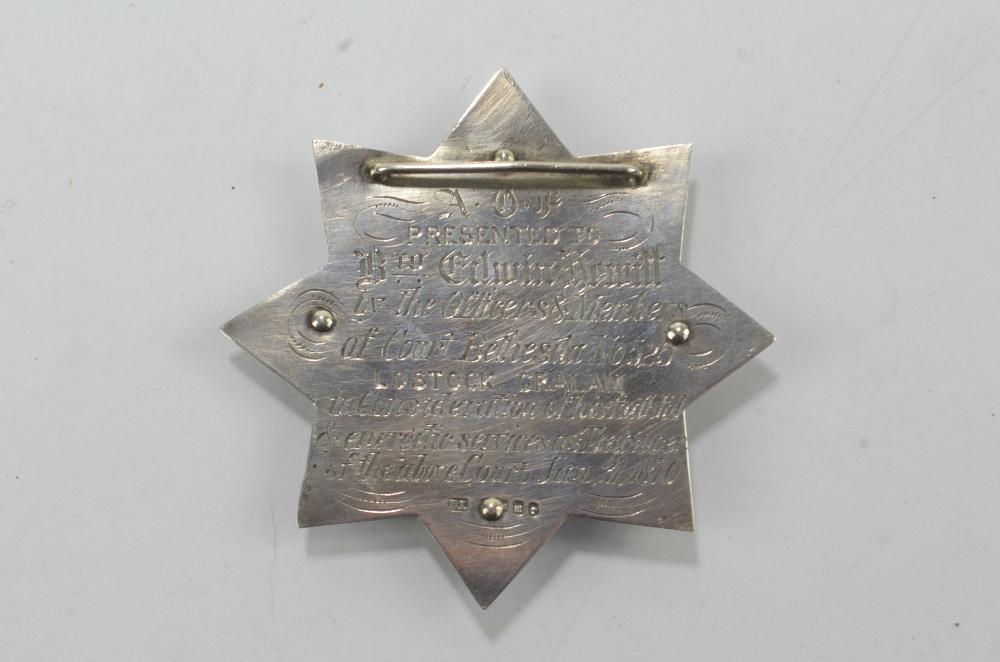 Lot 104 of 2418: A local interest Victorian hallmarked silver Ancient Order of Foresters jewel with gilt device in relief with motto 'Unitas Benevolentia Et Concordia' to centre, engraved to reverse 'A.O.F presented to Bro. Edwin Hewitt by the Officers & Members of Court Bethesda 525 Lostock Gralam in Consideration of his faithful & energetic services as Treasurer of the above Court Jan, 21, 1870', Ezekiel Loewenstark, London 1867, diameter 7.5cm.