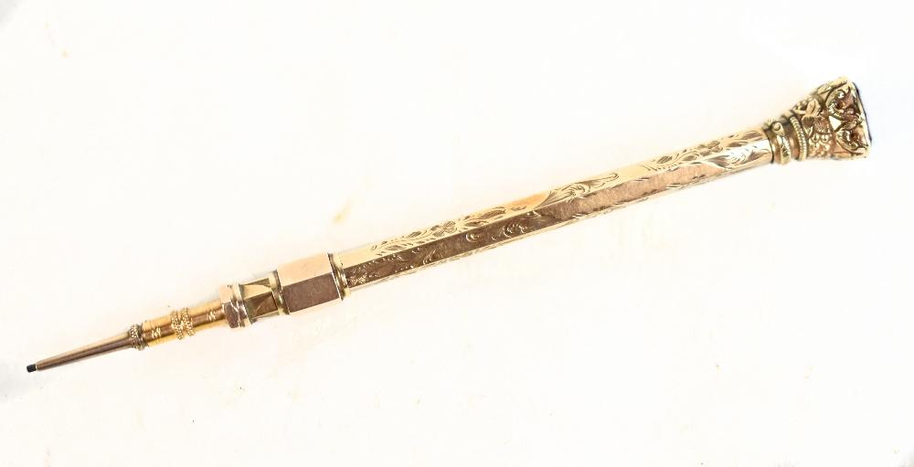 Lot 110 of 2418: A yellow metal mounted propelling pencil with bright cut foliate decoration and vacant cartouche, unmarked.