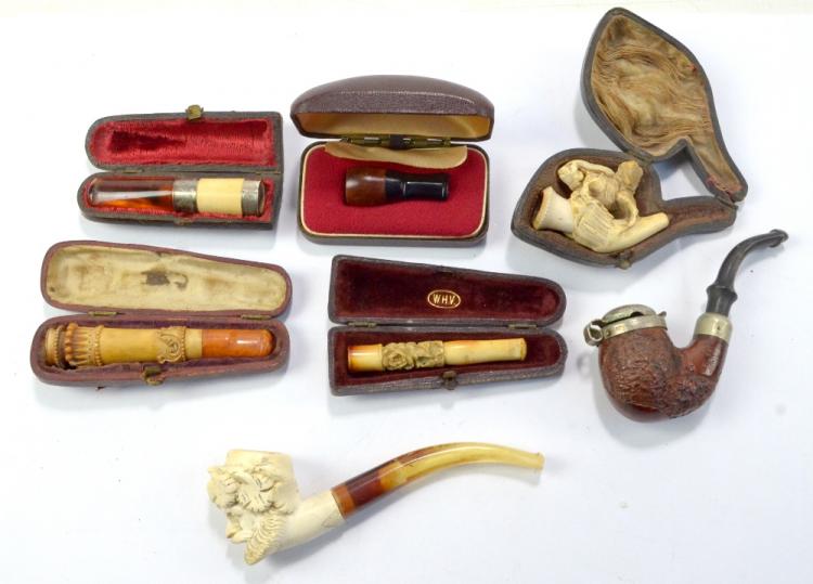 Lot 111 of 2418: A small group of pipes and cheroot holders including clay and meerschaum examples, predominantly cased.
