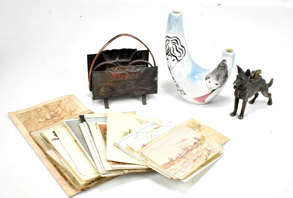 Lot 117 of 2418: A 20th century cast spelter table lamp modelled in the form of an Alsatian, length 13.5cm, a copper letter holder in the Art Nouveau style, retro Italian ceramic bud vase and a quantity of assorted postcards.