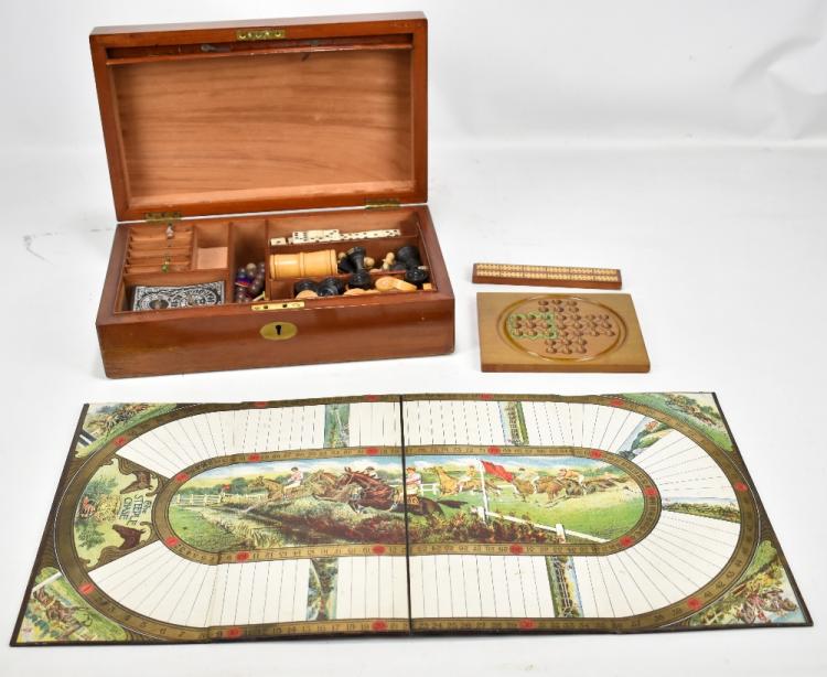 Lot 3 of 2139: A late 19th/early 20th century mahogany games box, the hinged cover enclosing various games to include chess, draughts, dominoes, etc, length 35cm.