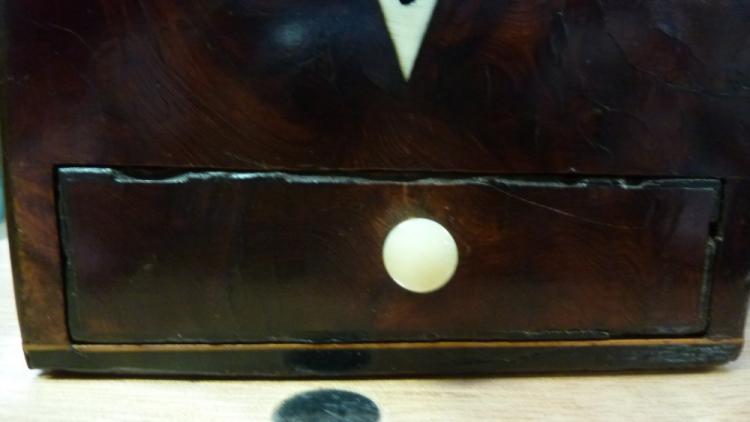 Lot 4 of 2139: A Georgian inlaid yew wood gentleman's travelling vanity box, the hinged lid enclosing a mirror and fitted compartments, with single frieze drawer, length 22cm.
