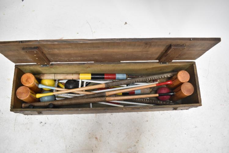 Lot 69 of 2139: A vintage croquet set in hinged box stamped 'J.A.S Schoolbred & Co, Tottenham Court Rd' including four mallets each stamped 'Slazenger London', four balls, six metal hoops, two large pegs etc, width of box 104cm.
