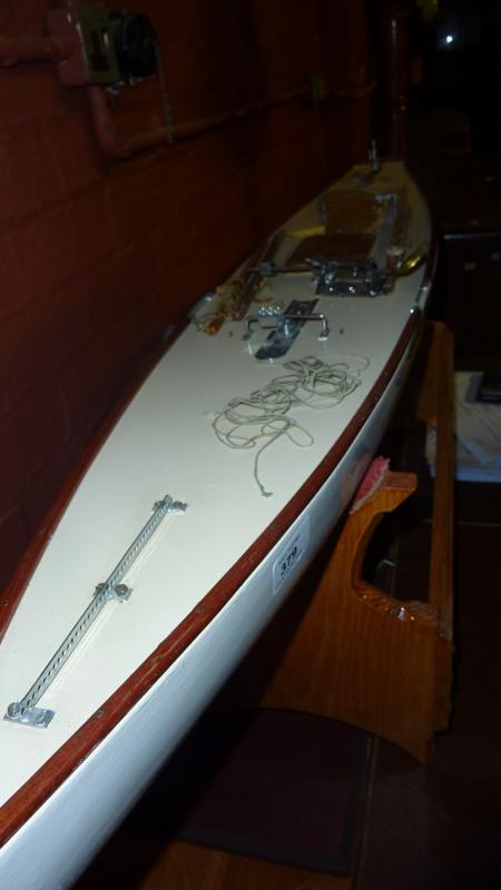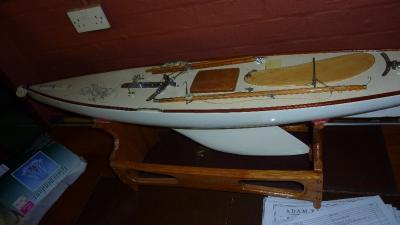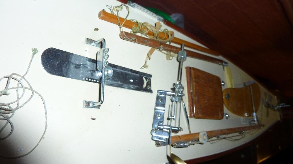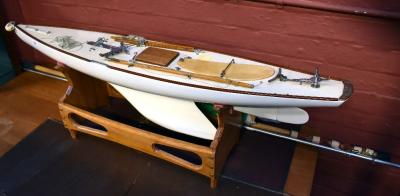 Lot 379 of 2139: A large scratch built pond yacht entitled 'Irene LMYC' to plaque, with mast and sails, with lead keel, length approx 125cm, on stand.