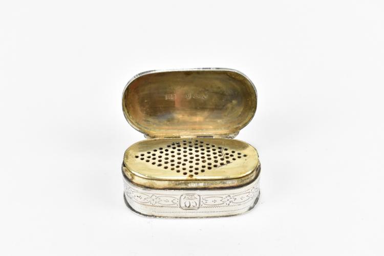 Lot 1288 of 2139: An early 19th century hallmarked silver oval vinaigrette, the hinged lid with engraved detail and traces of engraved initials to the cartouche enclosing a simple pierced grille, with band of engraved decoration to the base section, hallmarks obscured, width 5cm, approx 31.5g.