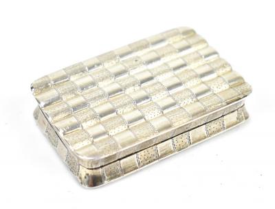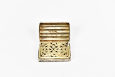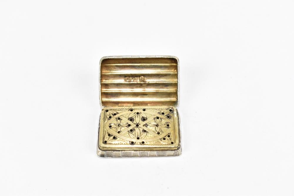 Lot 1289 of 2139: JOSEPH WILMORE; an early 19th century hallmarked silver vinaigrette of rounded rectangular form, with textured ribbed body and with pierced gilt washed grille, hallmarks slightly obscured, width 4.4cm, approx 23g.