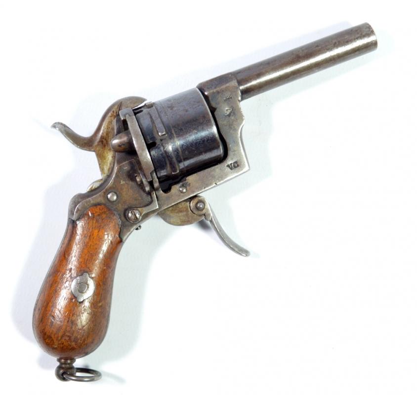 Lot 396 of 1701: A small Belgian six shot pinfire revolver, stamped 'VC' to the frame and 'ELG' within an oval to the cylinder, and with walnut stock, length 17cm.