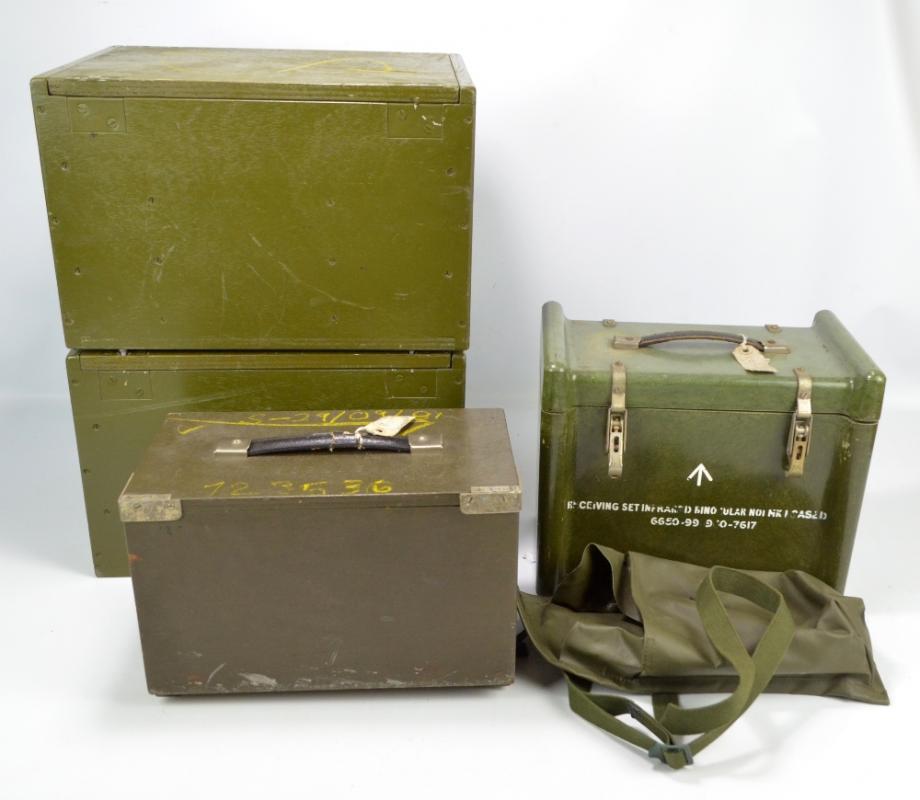Lot 932 of 1701: Three mid-20th century military wooden green painted equipment boxes, one with canvas bag to fitted top tray, with fitted compartments beneath and one stamped 939D038 to the top, also a small sized khaki rubber/plastic backpack with canvas straps (5).
