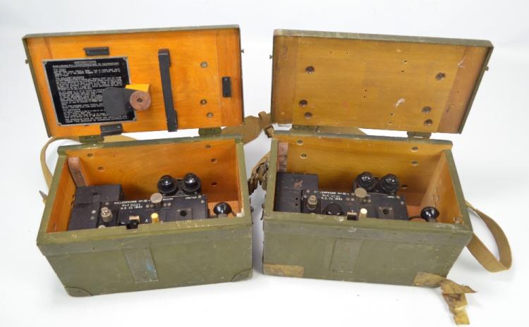 Lot 933 of 1701: Two wooden cased WWII period Fullerphone mkIV Morse code devices, no.6334 and 6742, one retaining fittings and instructions plate to the underside of the lid, both stamped with broad arrows and Canadian issue marks (2).