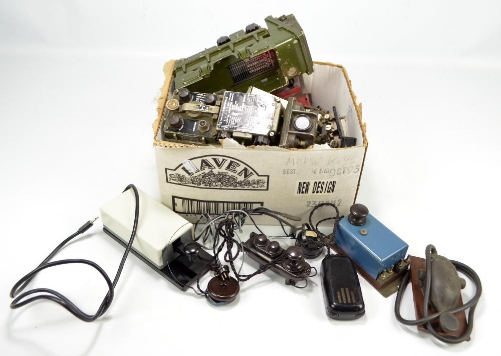 Lot 938 of 1701: A collection of Morse code devices including an AM military issued example with alphanumeric and response codes to top, antenna length chart to base, stamped with broad arrow mark and further 'Rectangular-316 R.P.I./7009/203' and sticker for Rank Precision Industries Ltd with a quantity of further Morse keys, including two military issue examples.
