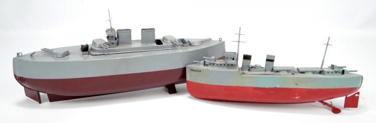 Lot 1265 of 1701: Two Sutcliffe tinplate model warships painted in grey and red, the smaller with name decal 'Grenville', the larger with removable top and the smaller with screwed on top, both with stamped manufacturer's marks, the larger approx 39cm in length (2).