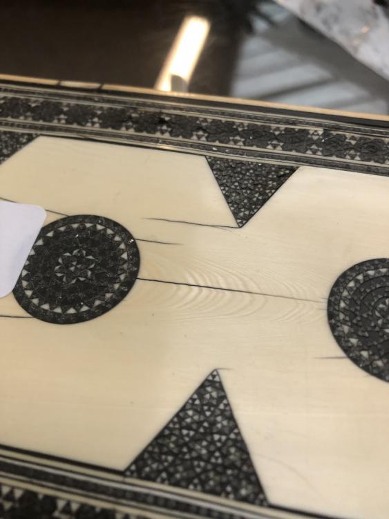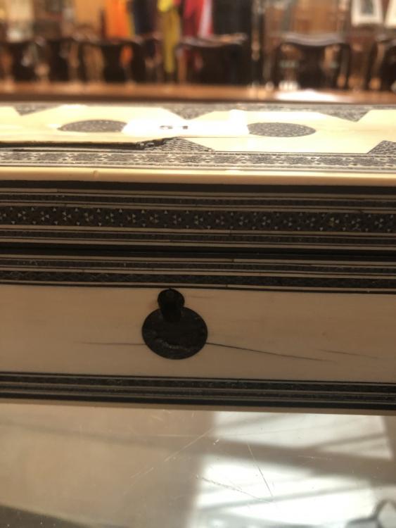 Lot 51 of 1540: A circa 1900 Anglo-Indian Vizagapatam-type rectangular ivory and micromosaic inlaid box with sandalwood interior, 26.5 x 10.5 x 6.55cm (af).