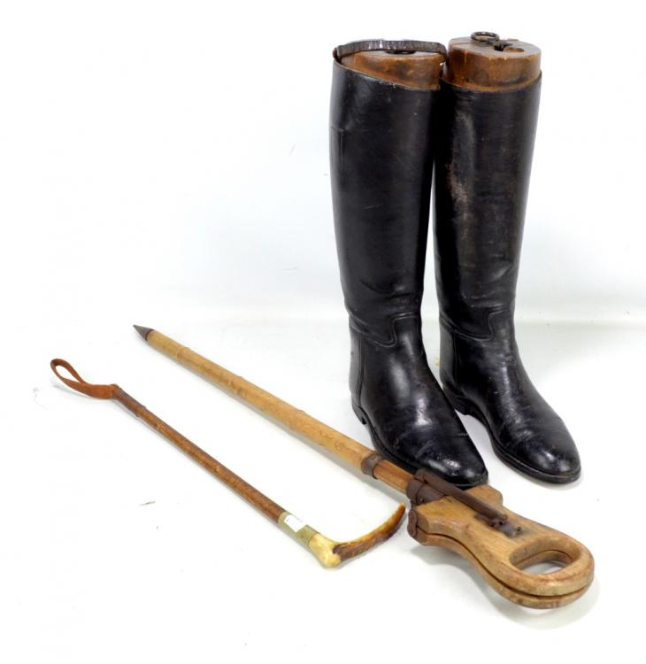 Lot 83 of 1540: A small group of collectors' items comprising a shooting stick, a riding crop, and a pair of Mister Minit leather riding boots with boot lasts (4).