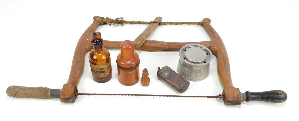 Lot 97 of 1540: A small group of collector's items comprising Victorian treen mercury dropper and cased clear glass medicine bottle with screw top inscribed 'H. Gilberts London', a chloroform bottle with label, a pewter ink well, a powder flask and a saw (6).