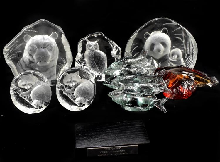 Lot 463 of 1540: MATS JONNASSON; five clear and frosted glass paperweights, each decorated with animals to include the panda family, and three Svensk glass sculptures.