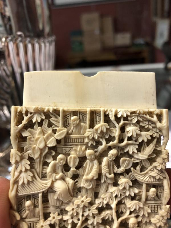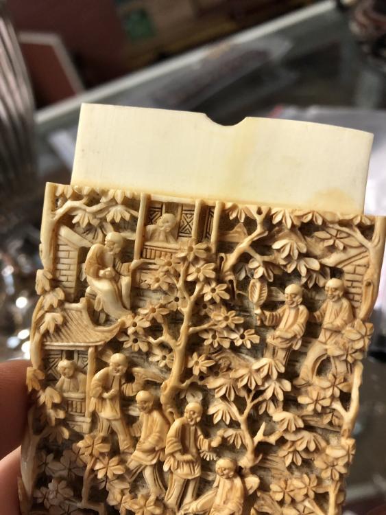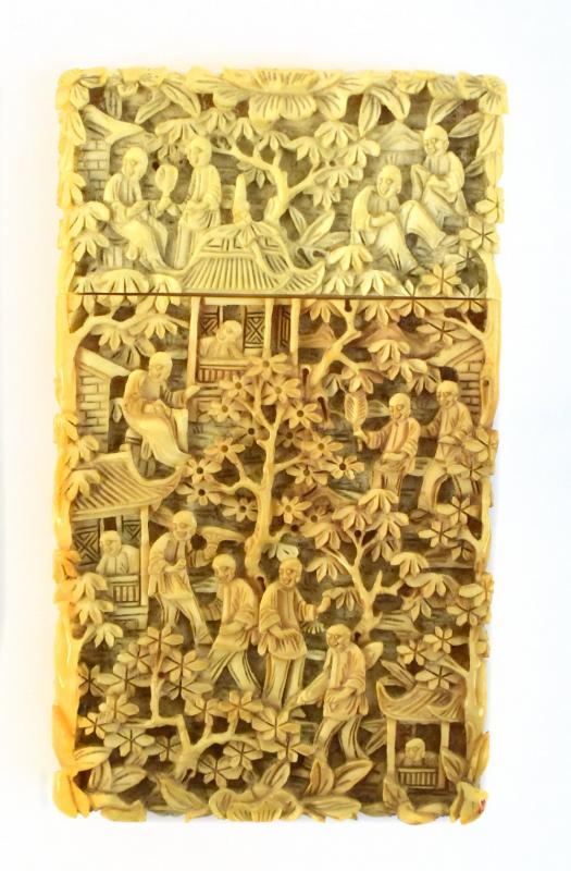 Lot 464 of 1540: A 19th century Cantonese carved ivory card case, decorated with figures and temple scenes, 10 x 5.5cm.