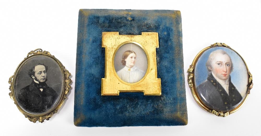 Lot 676 of 1540: A 19th century portrait miniature depicting a young lady wearing a necklace and a light blue dress, identified verso as Gracie Baird (later Mrs Archibald J Miller), 3.7 x 2.9cm, framed and glazed (af), a further portrait miniature depicting a gentleman in formal dress, unsigned, and an ambrotype depicting a gentleman, both in glazed gold plated frames (3).