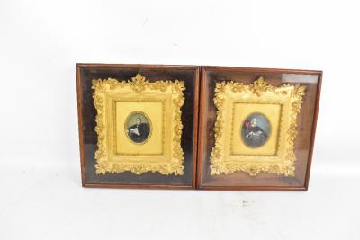 Lot 677 of 1540: A pair of 19th century portrait miniatures depicting a gentleman and his wife in formal black dress, unsigned, both set in floral moulded gilt frames within glazed frames, the latter and slightly larger approx 5.5 x 4.5cm (2).
