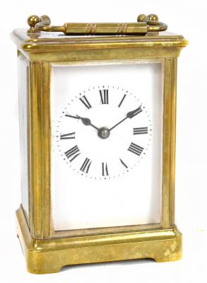Lot 1303 of 1540: A circa 1900 French brass carriage clock, the white enamel dial set with Roman numerals and the door no.4 (af).