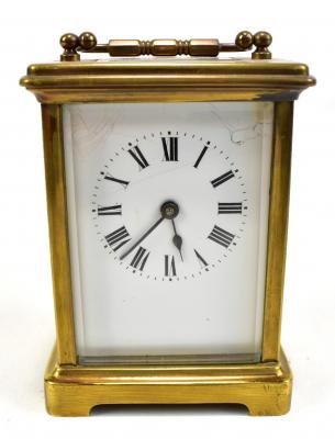 Lot 1304 of 1540: An early 20th century brass carriage clock, the white enamel dial set with Roman numerals, swing loop handle and case no.447, height 11.5cm (dial af).