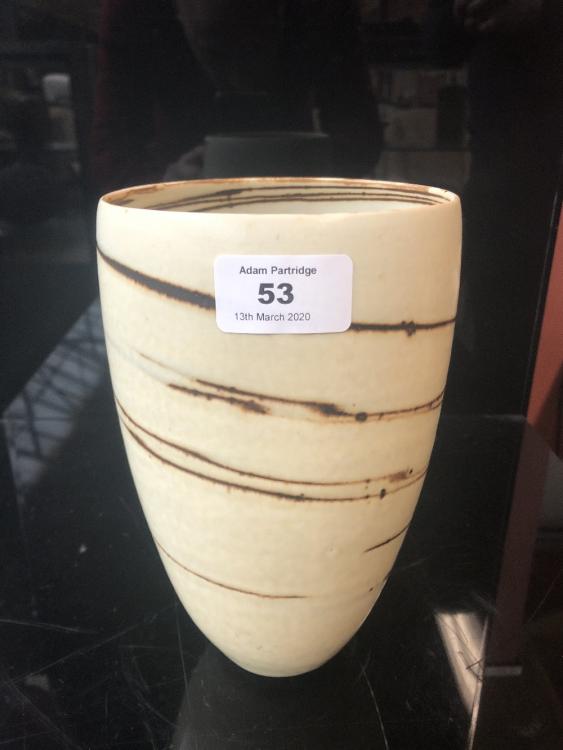 Lot 53 of 669: JOANNA CONSTANTINIDIS (1927-2000); a oval porcelain vase, mottled oatmeal glaze with integral iron spiral decoration, impressed C mark, height 19.5cm. (D)