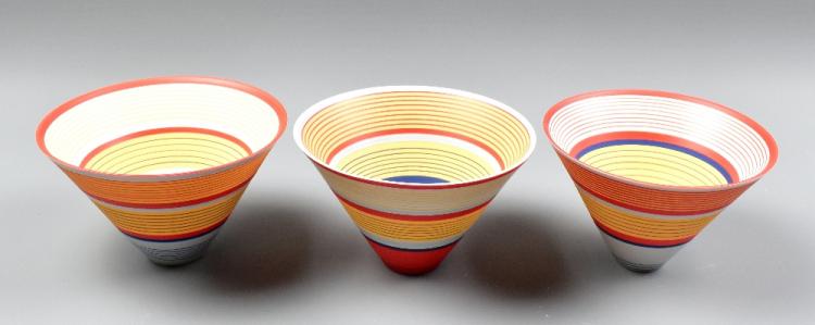 Lot 336 of 669: SARA MOORHOUSE (born 1974); a set of three conical porcelain bowls, brightly painted concentric rings of underglaze colours, incised SM marks, largest diameter 14cm (3).