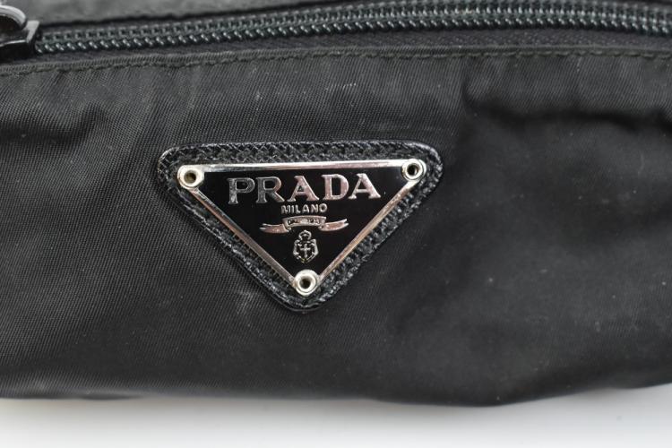 Lot 33 of 2698: PRADA; a black Milano nylon handbag with chain and leather handles, 38 x 28 x 8cm and a small matching Milano nylon cosmetic purse (2).