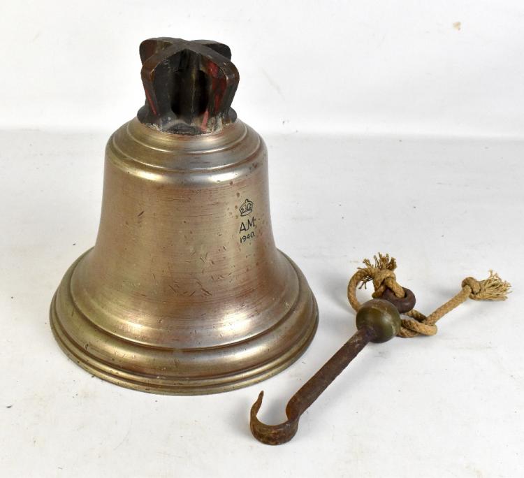 Lot 531 of 2698: A military gun metal Air Ministry ship's bell, impressed with a crown A.M and dated 1940, height 28cm.