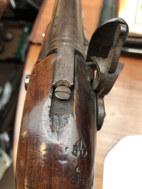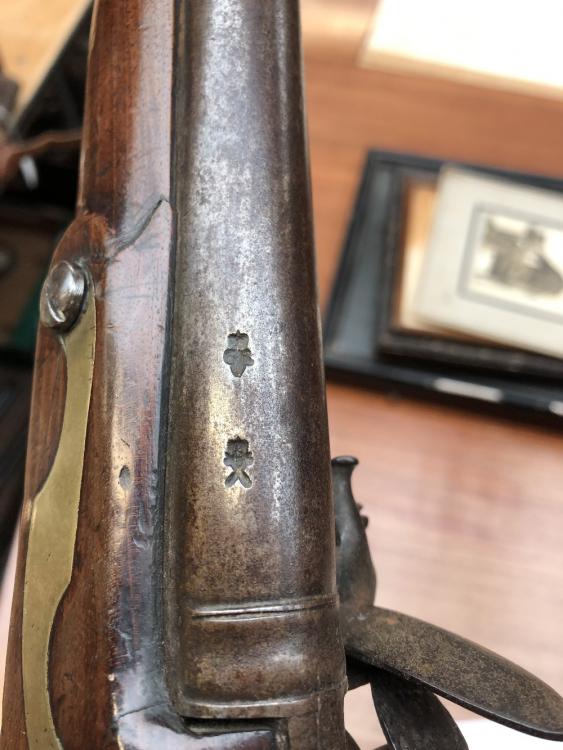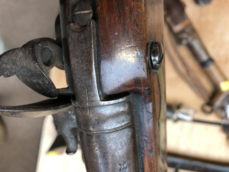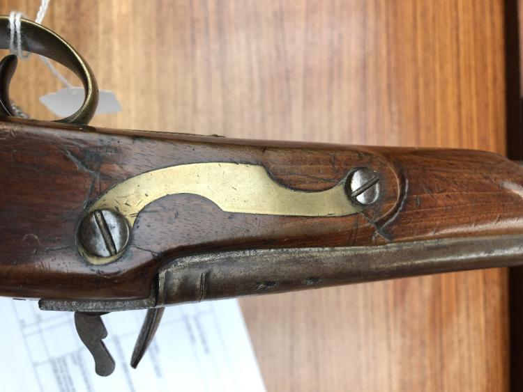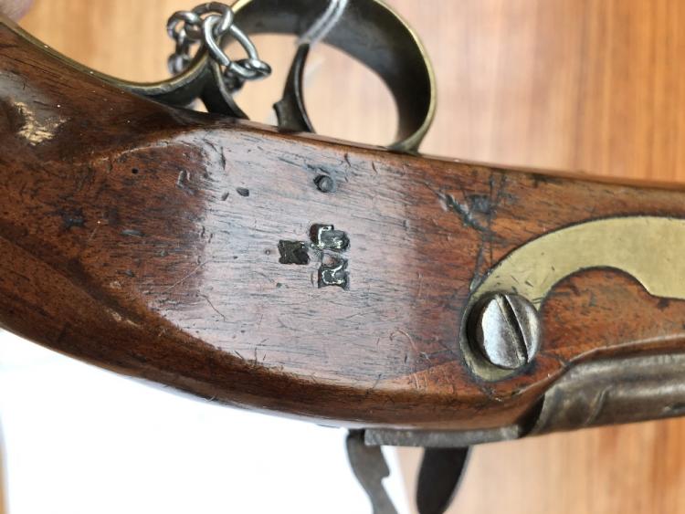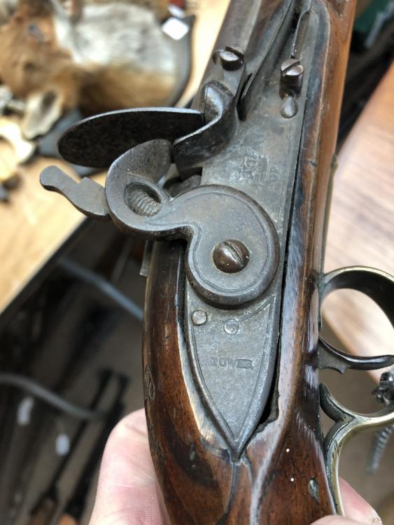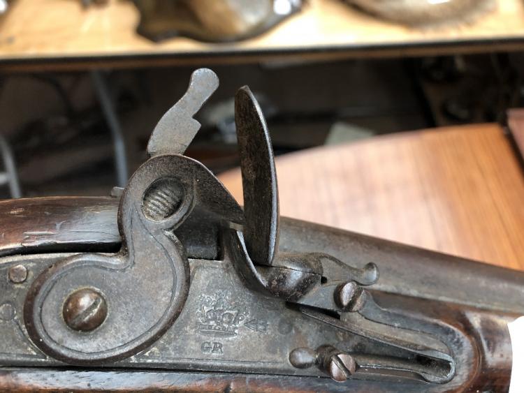 Lot 609 of 2698: A 19th century flintlock pistol, the lock stamped 'Tower' and bearing crown cypher under GR, attached to a walnut stock stamped with the Board of Ordnance broad arrow and decorated with brass furniture, length of barrel 9", and a powder flask (2).