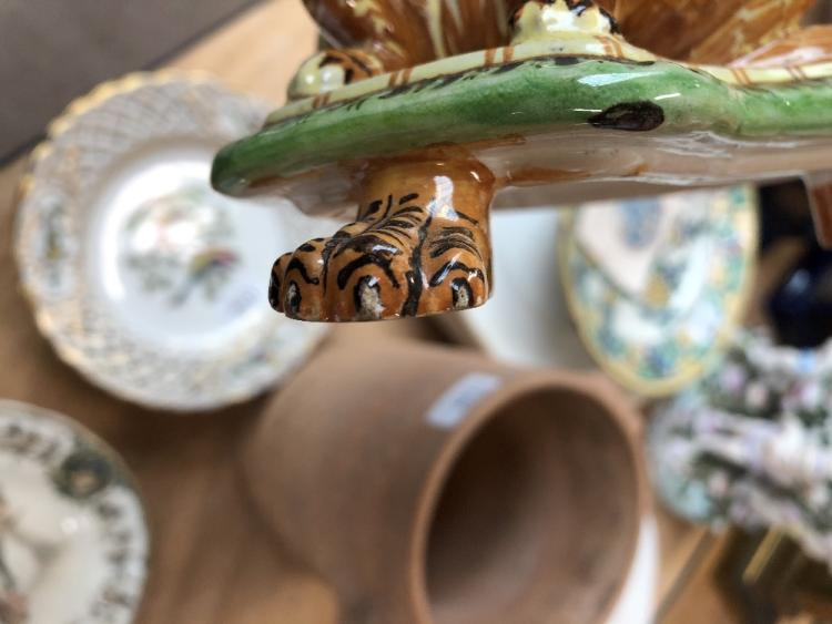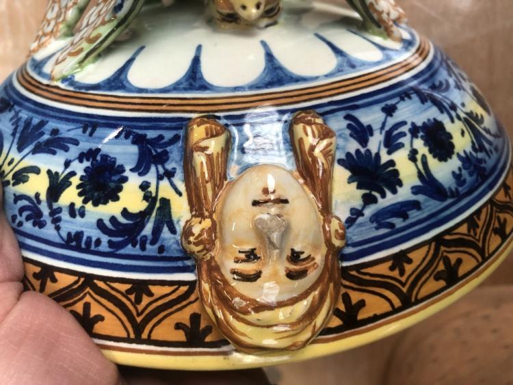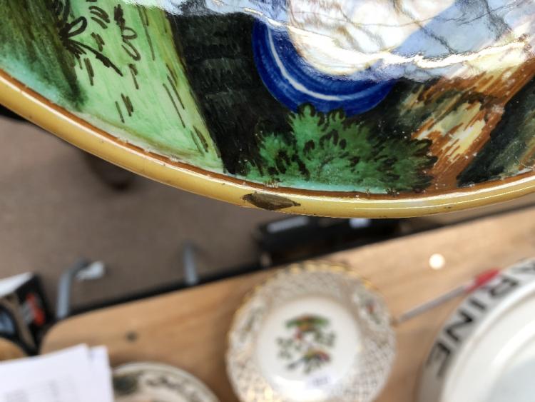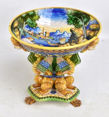 Lot 1160 of 2698: MOLARONI PESARO; an Italian maiolica comport, the bowl interior painted with classical type scene, including satyr playing the lyre in Italianate landscape, the exterior with foliate detail and three female busts, raised on column modelled as three griffins to shaped base and paw feet, signed to base, 21 x 23cm.