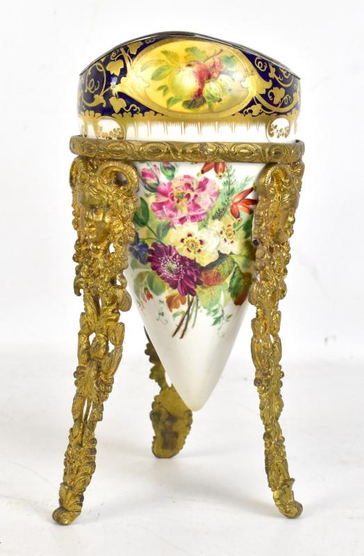 Lot 1169 of 2698: A Bevington floral and fruit decorated porcelain vase with white metal rim and of conical form set in a pierced gilt metal stand, height including stand 25cm.
