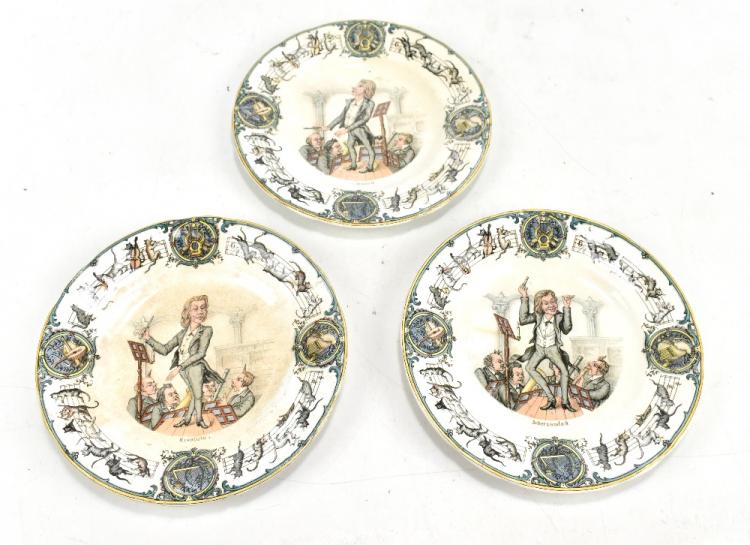 Lot 1170 of 2698: SARREGUEMINES; three transfer decorated plates from the 'musique' series each piece centred with a conductor within a border of cats playing instruments upon music scores, each piece with painted and impressed marks, diameter 20.5cm (3).